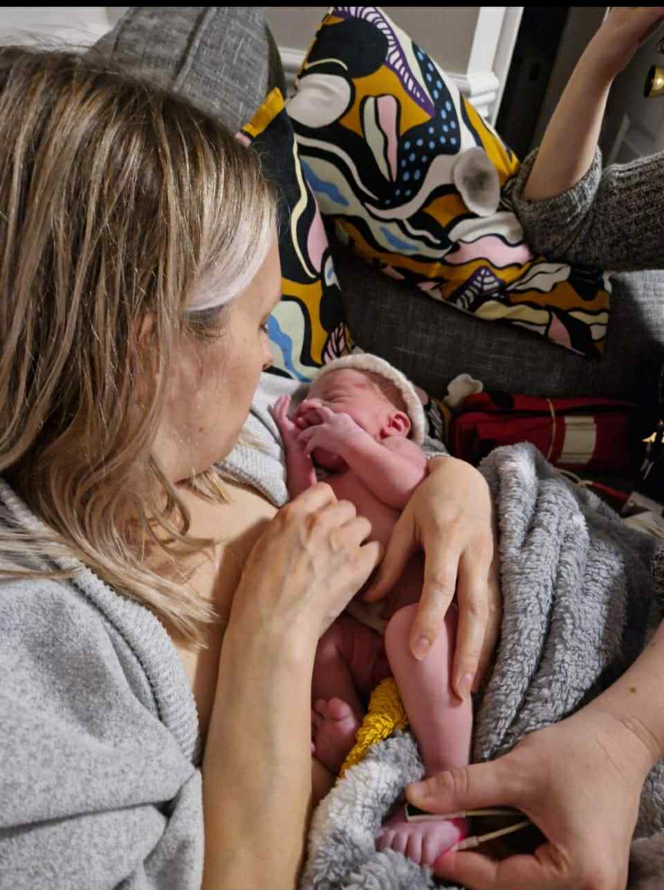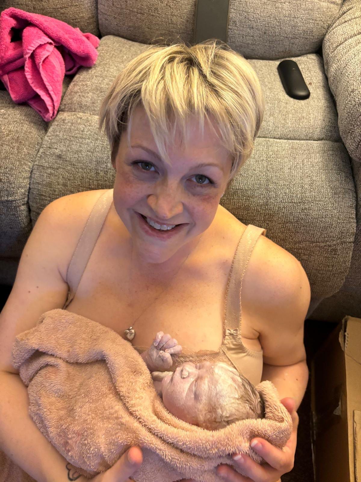 By the time our friend arrived I knew there was no way I would get to the hospital, the baby was coming! My husband called an ambulance, and our friend went to get towels. I was on my knees leaning on the sofa and the contractions were coming thick and fast! The ambulance arrived at about 9.20pm and the paramedics were keen to get me to the hospital, but I knew there was no time, I needed to push!